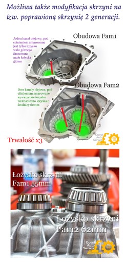 - Zastosowano łożyska o nieco większej średnicy ale o znacznie większej powierzchni tocznej co znacząco zwiększyło trwałość eksploatacyjną poprawionych skrzyń.