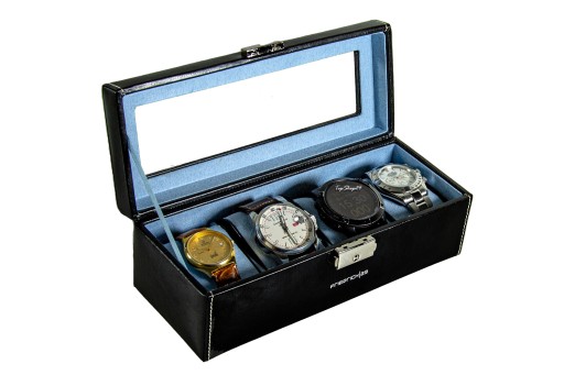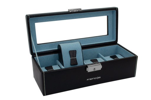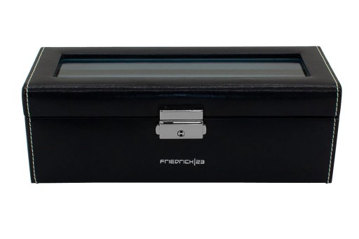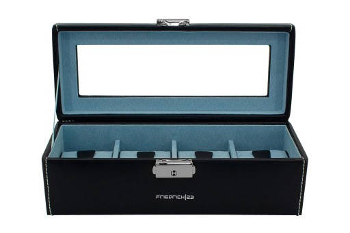 Pudełko ( etui) skórzane na 4 zegarki z dużym przeszkleniem- skóra ekologiczna czarne. Bond Collection. Produkcja niemiecka- Friedrich/23. Perfekcyjna jakość wykonania. Duże, miękkie i idealnie spasowane poduszki pod zegarki.