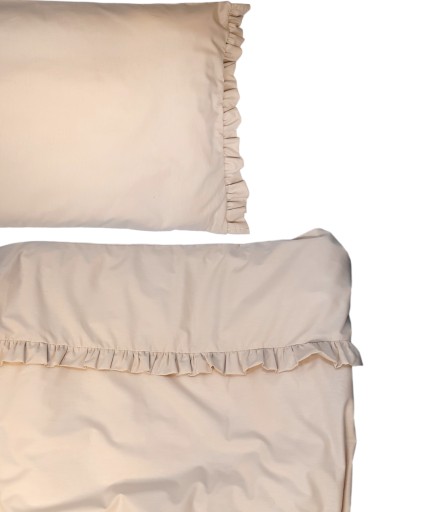 - Pościel wykończona bawełnianą falbanką na 2 bokach poszewki poduszki i po jednej stronie na kolderce