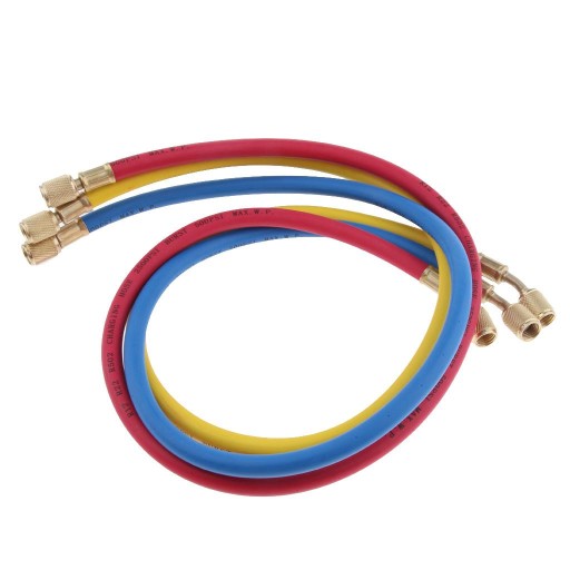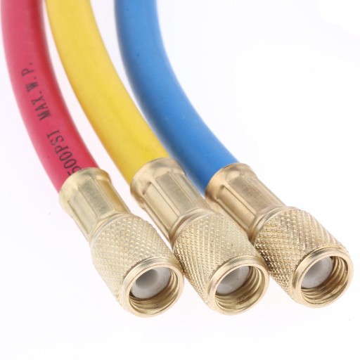 Czerwony manometr dla wysokiego ciśnienia, niebieski manometr dla niskiego ciśnienia; Zawiera 3 sztuki wyjątkowo długich węży do ładowania