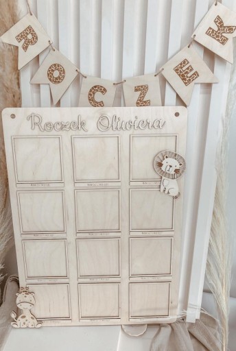 Personalizowana drewniana tablica na zdjęcia z pierwszego roku dziecka. Tablica idealnie spisze się jako dekoracja podczas urodzinowej uroczystości, a także ciekawie przystroi pokoik dziecka.