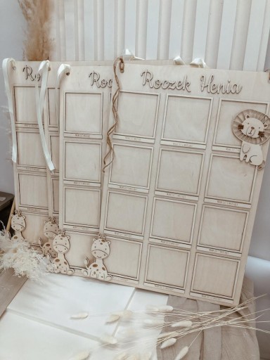 Tablica roczkowa na zdjęcia posiada 12 miejsc na zdjęcia wraz z podpisem (Mam już miesiąc, Mam już 2 miesiące itd.) o wielkości 12 x 12 cm.