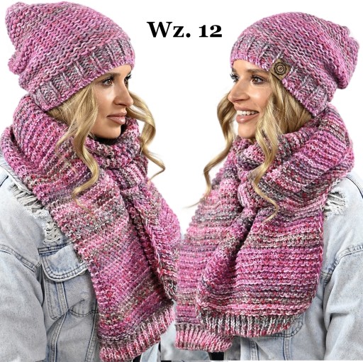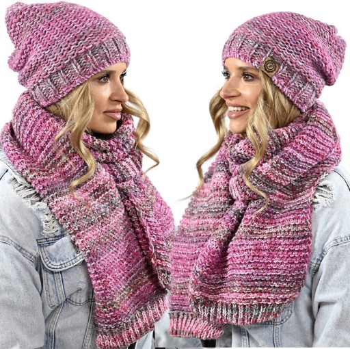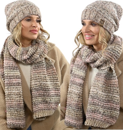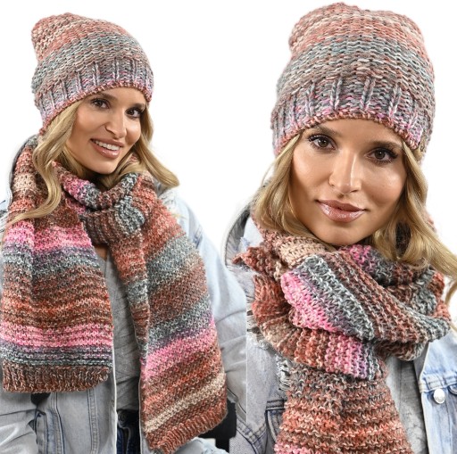Komplet na tle innych wyróżnia - melanżowy wzór, obszerny SZALIKI, Czapka beani, która pasuje do każdej twarzy. Ciekawa kolorystyka dopasuje się do każdego koloru kurtki, płaszcza.