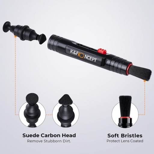 • Pióro czyszczące: Pióro dwustronne: środek do czyszczenia obiektywu Może być używany do delikatnego i dokładnego usuwania kurzu i brudu z krawędzi obiektywu lub w małych szczelinach. Bezpieczniejszą alternatywą dla używania szmatek lub chusteczek do czyszczenia obiektywu jest czyszczenie węglowe końcówka tego pióra usunie odciski palców i tłuszcz, nie pozostawiając żadnych włókien ani zanieczyszczeń.