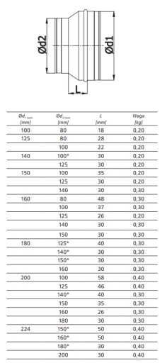 Najczęściej stosowany jako połączenie rur spiro sztywnych o różnych średnicach.