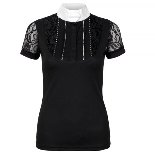 Młodzieżowa koszulka konkursowa Patricia z krótkim rękawkiem. Dekolt ozdobiony koronką oraz rzędami kryształków. Ukryte zapięcie na napy sprawia, że koszulka wygląda niezwykle elegancko. Rękawki wykonane z koronki.