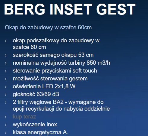 Okap kuchenny do zabudowy firmy BERG INSET 53 GEST