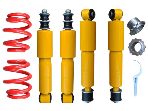 W skład zestawu wchodzą 2 sprężyny sportowe, amortyzatory przednie oraz tylne, tuleje regulacyjne tylne, klucz do regulacji wysokości oraz certyfikat TUV