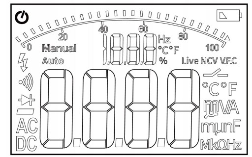 - Ikona automatycznego pomiaru natężenia, częstotliwości, cyklu, pojemności, rezystancji i prądu