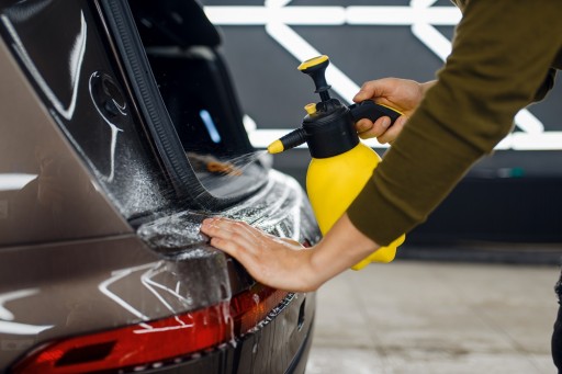 - Odklej folię od papieru podkładowego. Roztworem do aplikacji spryskaj warstwę klejącą oraz element, na który będzie aplikowana folia.
