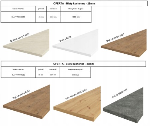 Nasza oferta pozwala Państwu wybrać kolor oraz rozmiar blatu. Posiadamy blaty 28 mm i 38 mm