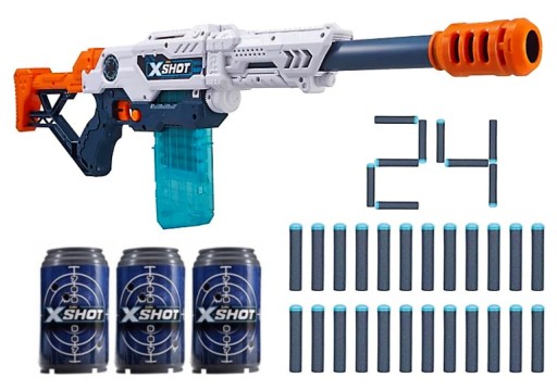 W zestawie otrzymasz KARABIN MAX ATTACK, 24 strzałki, magazynek, oraz trzy puszki.