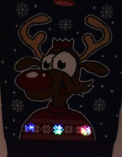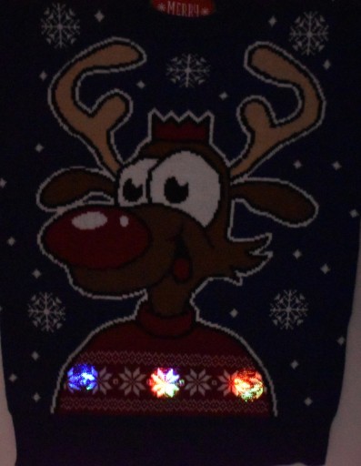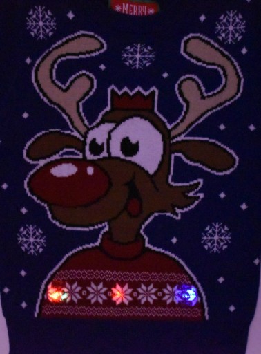 Świąteczny sweter z dużym wizerunkiem Renifera. Najfajniejsze w swetrze jest jednak to, że sweter świeci na wiele kolorów dzięki wszytym w swetrze trzem diodą LED. Trzy duże diody znajdują się w sweterku Renifera. Światełka uruchamiam się na ruch. Taki świecący sweter świąteczny rozbawi każdego. Idealny na prezent pod choinkę :)