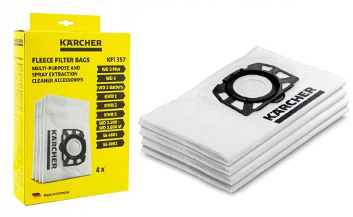Wyjątkowo odporne na rozdarcie flizelinowe torebki filtracyjne zostały specjalnie zaprojektowane do odkurzaczy Kärcher do czyszczenia na mokro i na sucho WD 2 Plus, WD 3, WD 3 Battery oraz KWD 1–KWD 3, jak również odkurzaczy piorących SE 4001/SE 4002.