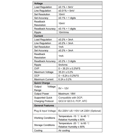 Czterocyfrowy wyświetlacz napięcia i prądu o wysokiej rozdzielczości; Standardowa funkcja szybkiego ładowania USB, obsługuje różne protokoły szybkiego ładowania; Funkcje przechowywania do 10 grup; W pełni izolowany port szeregowy, oprogramowanie obsługuje sterowanie wieloma zasilaczami; Wiele funkcji ochrony bezpieczeństwa; Wentylator regulacji temperatury o niskim poziomie hałasu; Wyjście 35 V/6 A jest stabilne i czyste; Sterowanie włączaniem/wyłączaniem wyjścia, funkcja blokady panelu jednym przyciskiem. Jest to doskonały zasilacz do konserwacji laboratoriów, linii produkcyjnych i sprzętu AGD.