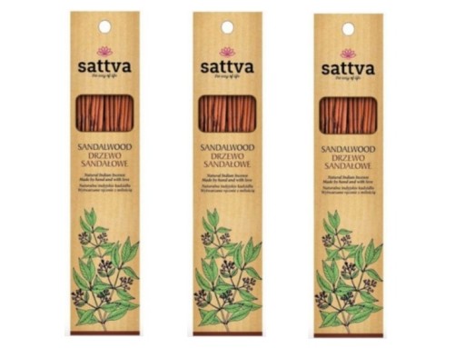 Tradycyjnie ręcznie robione kadzidełka Sattva Sandal wyprodukowane w Indiach. Tworzone według starożytnych sekretnych receptur. Uzdrawiające właściwości drzewa sandałowego wykorzystywane są w medycynie indyjskiej i chińskiej od stuleci. W Indiach sandałowiec używany jest w obrzędach duchowych i mistycznych. Drzewo sandałowe poprawia samopoczucie, rozjaśnia umysł i wzmacnia koncentrację. Kadzidła Sattva, wytwarzane są tylko z naturalnych składników takich jak miód, rzadkie proszki drewna, olejki eteryczne, przyprawy, ekskluzywne żywice. Proces tworzenia mieszanki oparty jest na sekretnej recepturze, tak jak to było 400 lat temu, zgodnie z zaleceniami starożytnych nauk wedyjskich, faz księżyca oraz cennymi tradycyjnymi tajemnicami.
