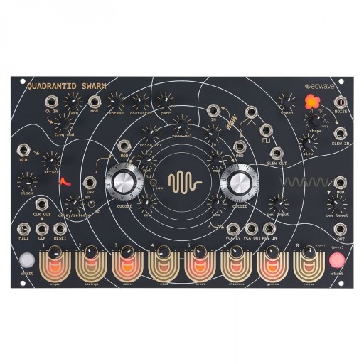 eowave Quadrantid Swarm to wszechstronny moduł Eurostojak wyposażony w dotykową klawiaturę pojemnościową. Syntezator Swarm jest idealny do zastosowań związanych z projektowaniem dźwięku, posiada wbudowane LFO z ośmioma przebiegami, kontrolę modulacji, sprężynę reverb, slew limiter i filtr dwubiegunowy.