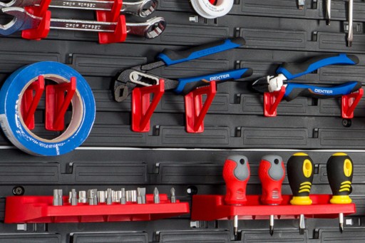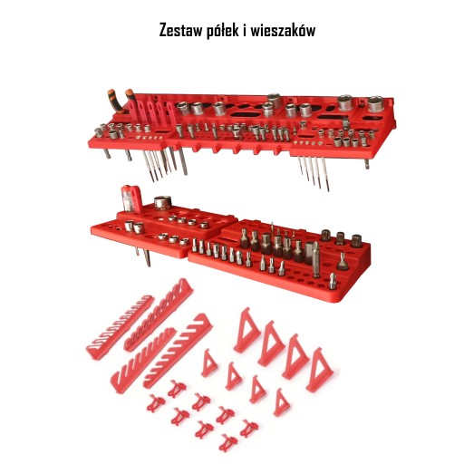 - W zestawie 40 sztuk kuwet, zestaw uchwytów do narzędzi (w sumie 20 sztuki), 3 półki, oraz 4 tablice ścienne 576 mm x 390 mm (po złączeniu 115 cm x 78 cm)