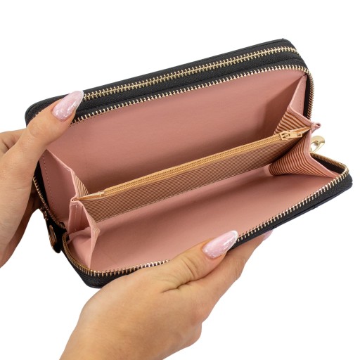 - Inne szczegóły: portfel zawiera: 8 miejsc na karty, przegrodę na monety oraz dwie komory na zamek błyskawiczny, grubość: 4,3 cm, dopinany pasek: 15 cm