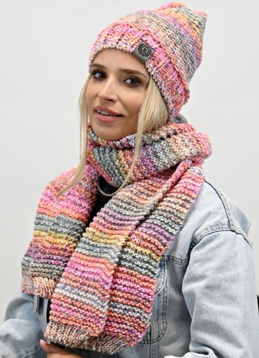 Komplet na tle innych wyróżnia - melanżowy wzór, obszerny SZALIKI, Czapka beani, która pasuje do każdej twarzy. Ciekawa kolorystyka dopasuje się do każdego koloru kurtki, płaszcza.