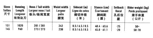 długość 151 cm (mid-wide), szerokość nose/tail 28.1 cm /28.1 cm, waist 24.2 cm, promień 8.5/6.5/8.5 m, stance 48.4-63.6 cm, nadaje się dla osób z wagą 50+ kg