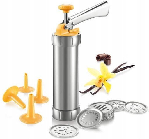 ✅ Zestaw zawiera 20 krążków wyciskających, 4 dysze do dekorowania oraz dozowniki do małych i dużych ciastek.
