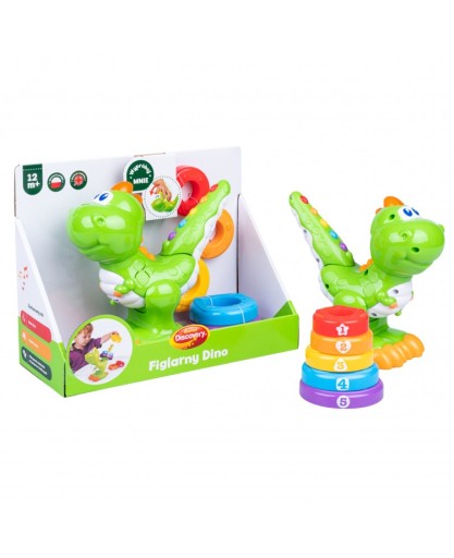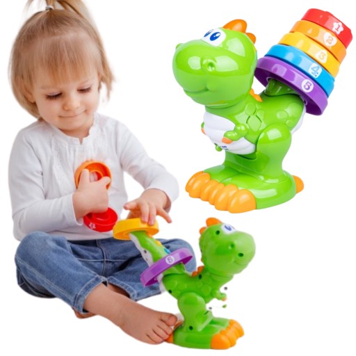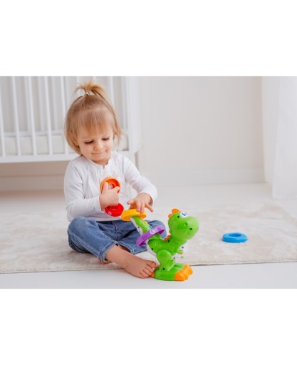 Ten uroczy zwierzak posiada ruchomy ogon, na którym umieszcza się kolorowe obręcze, w kolejności od największej do najmniejszej. Poszczególnym pierścieniom odpowiadają kolorowe kuleczki na dinusiowym ogonie, dzięki czemu maluch bez trudu je dopasuje.