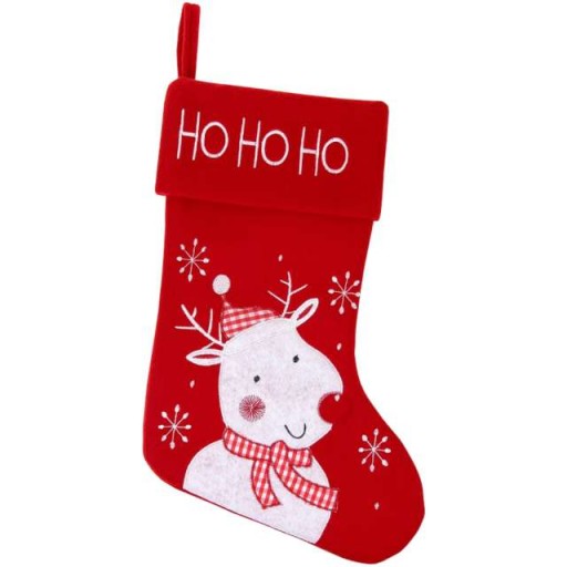Skarpeta na prezenty w kolorze czerwonym z nadrukiem białego renifera oraz kultowym okrzykiem świętego Mikołaja "HO HO HO". Skarpeta posiada przyszyte ucho, aby można ją było powiesić - np. na kominku lub na drzwiach. Będzie to z pewnością doskonała świąteczna ozdoba.