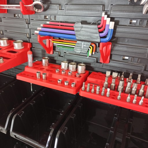 - W zestawie 27 sztuk kuwet, zestaw uchwytów do narzędzi (w sumie 20 sztuk), 3 półki, oraz 4 tablice ścienne 576 mm x 390 mm (po złączeniu 115 cm x 78 cm)