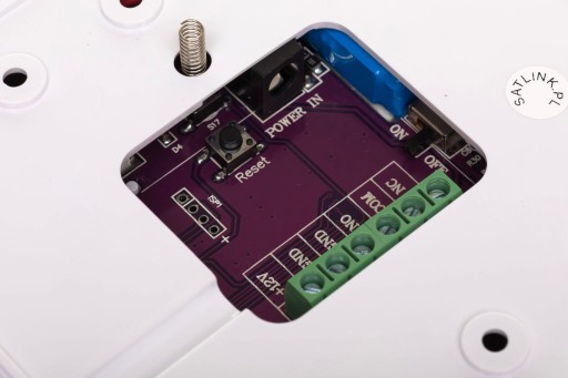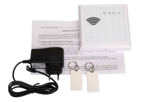 Klawiatura zasilana jest z zasilacza 12V, który jest w komplecie. W zestawie znajdują się również 2 pastylki RFID, które służą do szybkiego rozbrojenia alarmu.