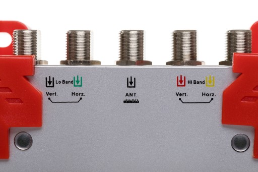 W górnej części multiswitcha jest 5 wejść do podłączenia sygnału z 1 satelity oraz z anteny naziemnej. Cztery wejścia do podłączenia konwertera quattro są oznaczone odpowiednio Vert/Lo, Horz/Lo, Vert/Hi, Horz/Hi. należy je podłączyć pod tak samo oznaczone wyjścia w konwerterze. Środkowe wejście oznaczone ANT. służy do podłączenia sygnału z anteny naziemnej.