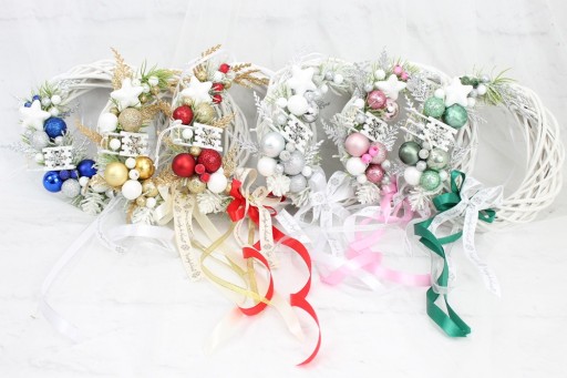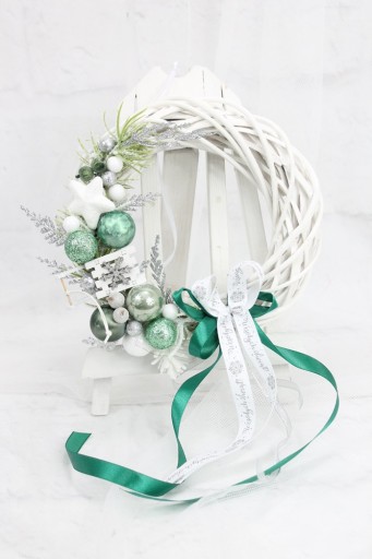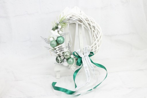 Niezwykle uroczy i delikatny wianuszek świąteczny wykonany z wysokiej jakości ozdób na podstawie z białego ratanowego wianka.