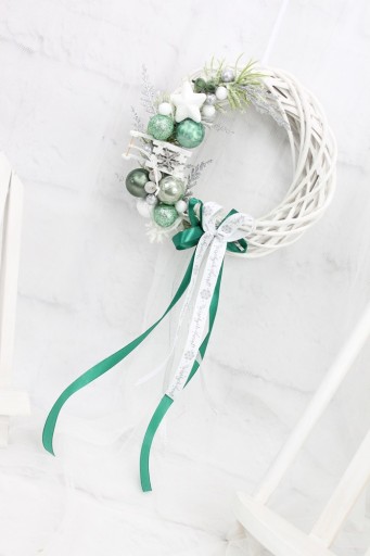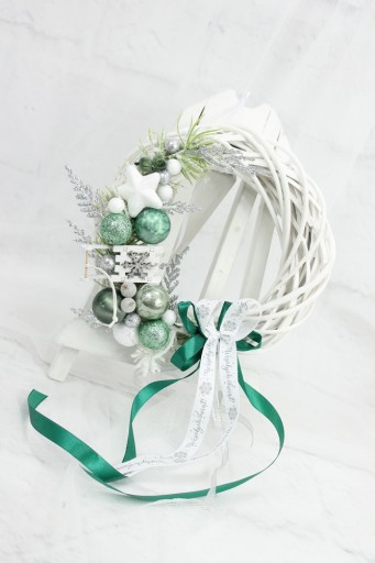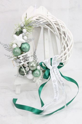 Utrzymany w tonacji zieleni i srebra z dodatkiem bieli i zieleni dekoracyjnych gałązek. Niezwykły dodatek stanową piękne drewniane sanki z gwiazdką oraz kaskadowo spływająca kokarda z napisem Wesołych Świąt.