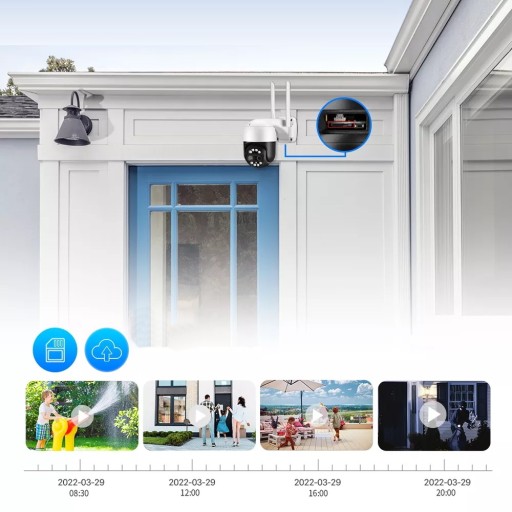 Obraz można zapisać na karcie pamięci lub w chmurze (dodatkowo płatna). Kamera obsługuje karty pamięci micro SD do 128GB.