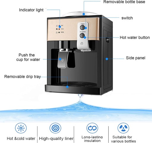 - Ten elektryczny dystrybutor gorącej i zimnej wody nadaje się do biurek, stolików nocnych, stolików kawowych, barów i innych miejsc, kompatybilny z wiadrami o pojemności 3,5 l, 5 l, 10 l i 18,9 l.