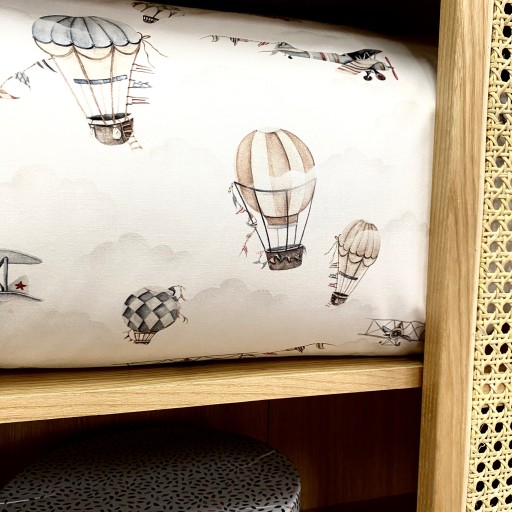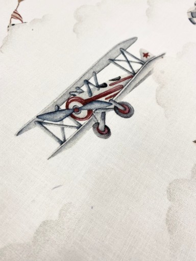 Pościel jest dwustronna, z jednej strony wzór w samoloty, druga strona to złamana biel w ciemnobrązowe kropki.