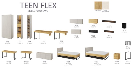 Jak urządzić pokój młodzieżowy tak by był modny, ponadczasowy, posłużył przez lata, a jednocześnie był funkcjonalny? Tutaj z pomocą przychodzą gotowe zestawy z kolekcji TEEN FLEX. Meble te charakteryzują się możliwością łączenia brył w różne gotowe sety i dają szerokie pole manewru w kwestii aranżacji wnętrza. Doskonale sprawdzą się zarówno podczas urządzania pokoju dla dziewcząt, jak i chłopców. Set składa się z siedmiu elementów: biurka TF-06, nadstawki TF-07, szafki wiszącej TF-10 i TF-12, półki TF-11, dwóch paneli TV TF-14 oraz szafki TF-08.
