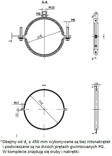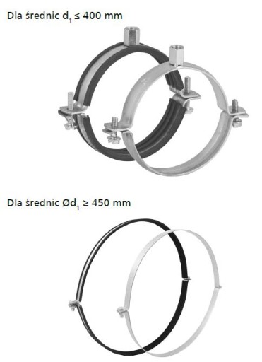 Obejma wykonana jest z dwóch części połączonych ze sobą za pomocą śrub stalowych. Do średnicy 400 mm włącznie jedna strona jest samozatrzaskowa dzięki temu usprawnia montaż obejm na kanałach wentylacyjnych. W tym zakresie średnic obejma montowana jest poprzez nitonakrętkę M8/M10 do pręta gwintowanego lub do śruby dwu-gwintowej.