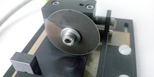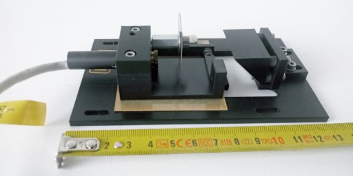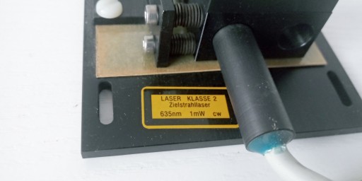 Laser liniowy o długości fali światła 635nm, moc 1mW, laser klasy 2, zdemontowany z wysokiej klasy urządzenia medycznego, przetestowany sprawny. Laser zaczyna śiecić od napięcia 2,5V DC, wraz ze wzrostem napięcia rośnie moc lasera. Laser jest przykrecony do aluminiowej obudowy, na trzech śrubkach regulacyjnych, z tależowymi podkładkami sprężynowymi, w celu precyzyjnego ustalenia kierunku wiązki. Dalej wiązka światła jest kierowana na lustro, zmieniajace kierunek wiązki o 90* (lustro również jest również na trzech śrubach regulacyjnych). Pomiedzy źródłem światła a lustrem, znajduje się przesłona, z napyloną warstwą pochłaniającą światło, proporcjonalnie z kątem obrotu przesłony.