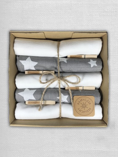 Komplet 5 sztuk najwyższej jakości pieluszek jest efektownie opakowany, gotowy do wręczenia jako prezent. W zestawie znajduje się również gratis w postaci firmowych klamerek.