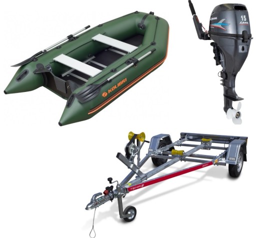 Przedmiotem aukcji internetowej jest zestaw składający się z pontonu KM-360D, silnika zaburtowego Sail 15KM i przyczepy podłodziowej Temared ECO B05.