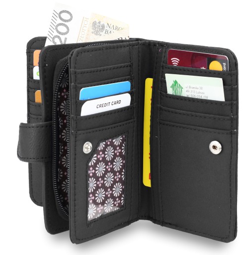 - Portfel zamykany na zatrzask + zamek błyskawiczny.