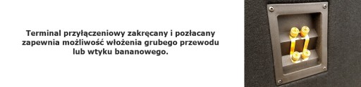 Obudowa głośnikowa typu bass reflex. W całości wykonana z MDF o grubości 18 mm. Otwór dla dwóch głośników o średnicy 30 cm, objętość- 100 litrów. Obicie kolor: Czarny