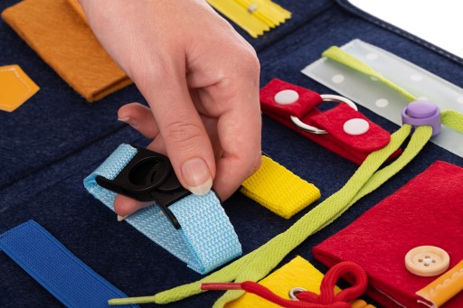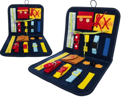 Dziecko zapozna się z tymi elementami i będzie mu łatwiej samemu zapiąć guzik w swetrze, zapiąć buty na rzep czy zasunąć spodnie.