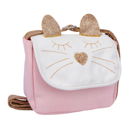 Piękna, słodka torebka dla każdej małej modnisi. Klapka torebki w kolorze białym ze złotymi uszkami i wyhaftowaną złotymi nićmi buzią kotka. Korpus torebki w kolorze jasnoróżowym. Pasek w kolorze złotym i z możliwością regulacji. Wymiary torebki 15x12x4 cm, maksymalna długość paska 100 cm. Torebka zapinana na nap ukryty pod klapką.