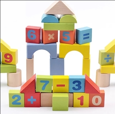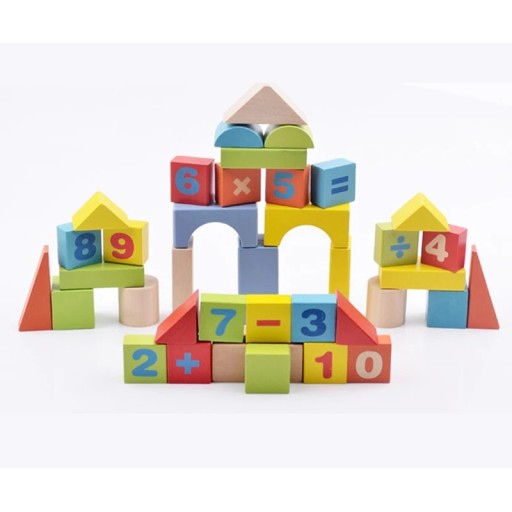 W pudełku znajdziecie Państwo 50 sztuk klocków o przeróżnych kształtach i kolorach w tym klocki w naturalnym kolorze drewna.
