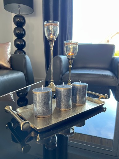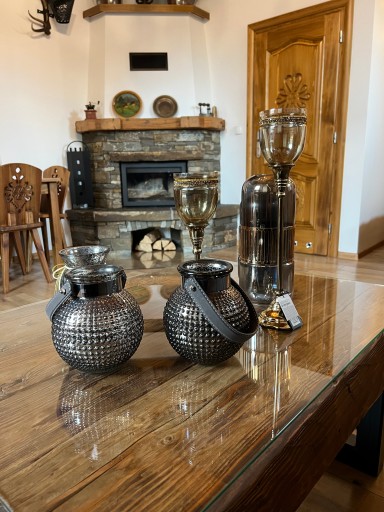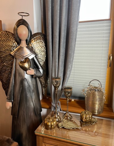 Piękny świecznik z dymionym szkłem w odcieniu zielonym ze zdobieniami. Na żywo wygląda jeszcze ładniej. Elegancki i gustowny. Zachwyci każdego gościa. Na innej aukcji drugi większy do kompletu