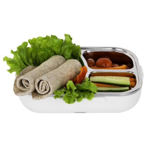 Lunch Box składa się wyjmowanego 3-komorowego pojemnika INOX, łatwego do umycia w zmywarce.