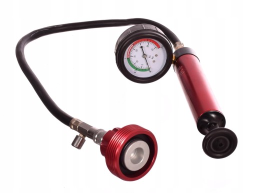 Profesjonalny tester szczelności układu chłodniczego i nagrzewnicy. Znajduje zastosowanie w pracach przy samochodach osobowych, dostawczych i ciężarowych. Dodatkowo w zestawie znajduje się termometr z długą nogą, którą wsadzamy do chłodnicy. Pozwala to sprawdzić sprawność działania termostatu. Zestaw wyposażony jest w 12 zakrętek do różnegor rodzaju chłodnic, które mocujemy z pompką za pomocą systemu szybkozłączek.