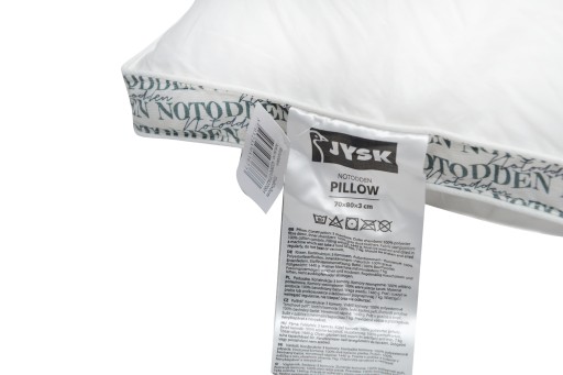 Poduszka NOTODD wypełniona jest naturalnym pierzem kaczym z domieszką włókna syntetycznego, dzięki któremu zachowuje dłużej swoją żywotność, nie zbijając się w środku. Poduszka długo zachowuje swój kształt i elastyczność. Miękkie pierze doskonale układa się pod głową, jest to odpowiednia poduszka dla osób, które śpią na boku, na brzuchu oraz na plecach. Jedną z największych zalet takiej poduszki jest to, że jej środek da się dowolnie układać. Naturalne poszycie 100% bawełniany batyst zapobiega poceniu się podczas snu.